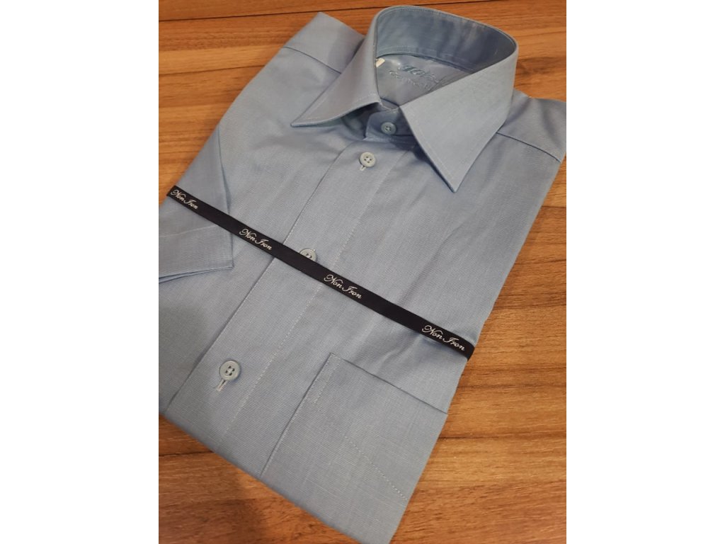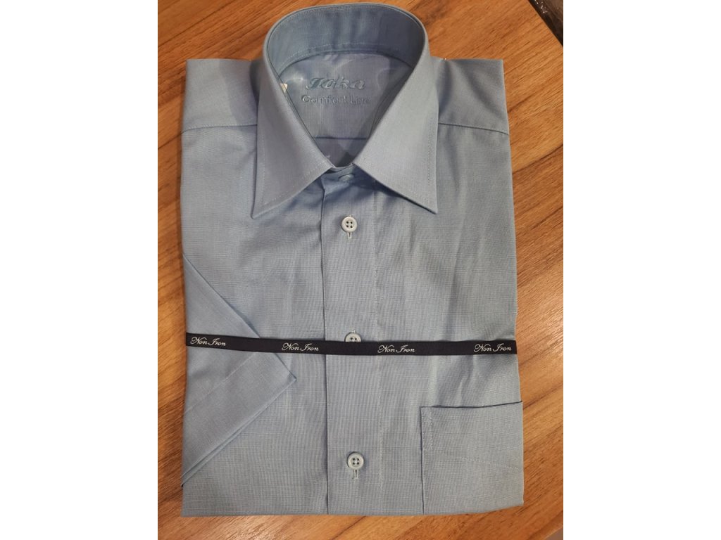 Pánská společenská košile s krátkým rukávem, je od firmy OP Prostějov, tudíž český výrobek. Košile se hodí do obleku ale i k riflím. Je to klasický střih. Košile má nežehlivou úpravu, tudíž košili stačí za mokra vyvěsit na ramínko a samo se vyrovná. U košile je přiložený přesný návod. Jedna náprsní kapsa, bez vzoru.