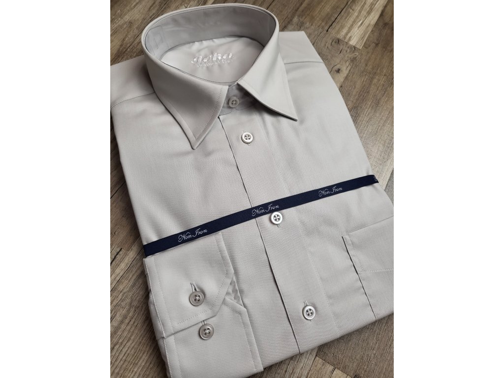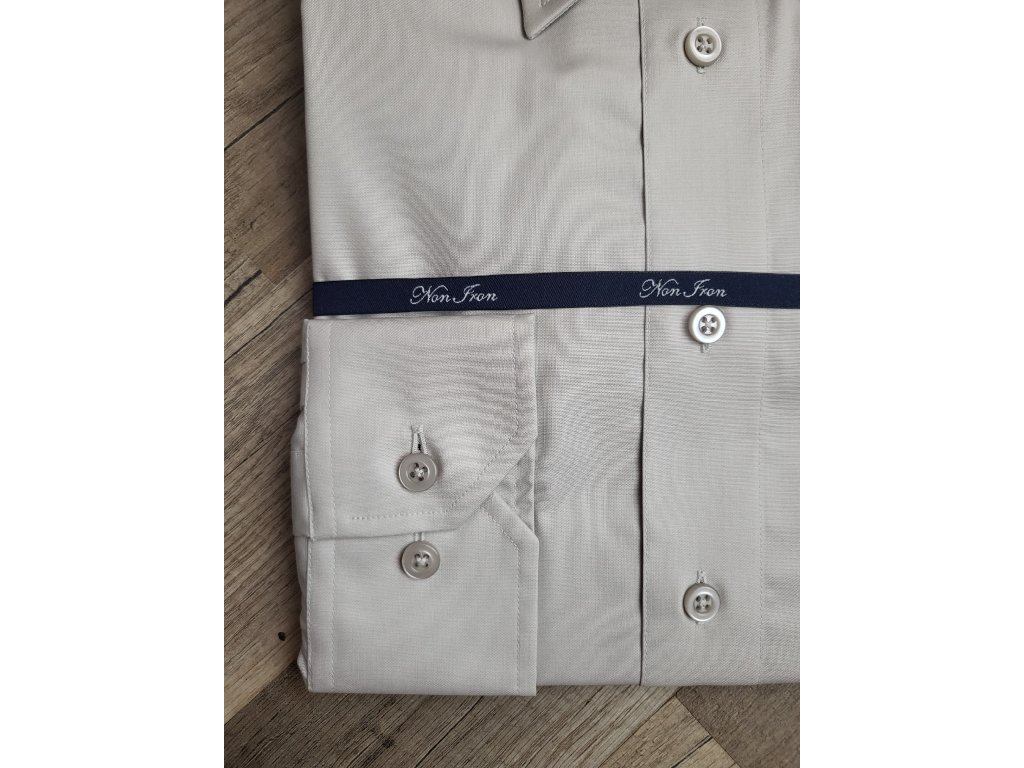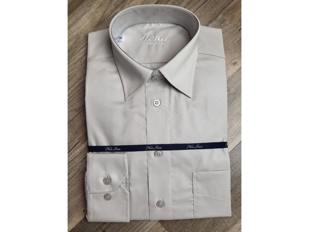 Pánská společenská košile s dlouhým rukávem, je český výrobek. Košile se hodí do obleku ale i k riflím. Je to klasický střih, s jednou náprsní kapsou. Košile má barvu světlé kávy, hodí se do černého nebo modrého saka. Košile má nežehlivou úpravu, tudíž košili stačí za mokra vyvěsit na ramínko a samo se vyrovná. U košile je přiložený přesný návod nebo popřípadě si jej můžete přečíst ve fotogalerii.