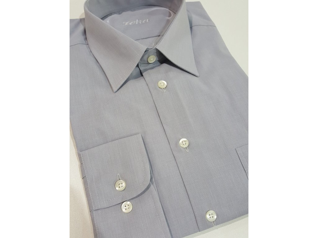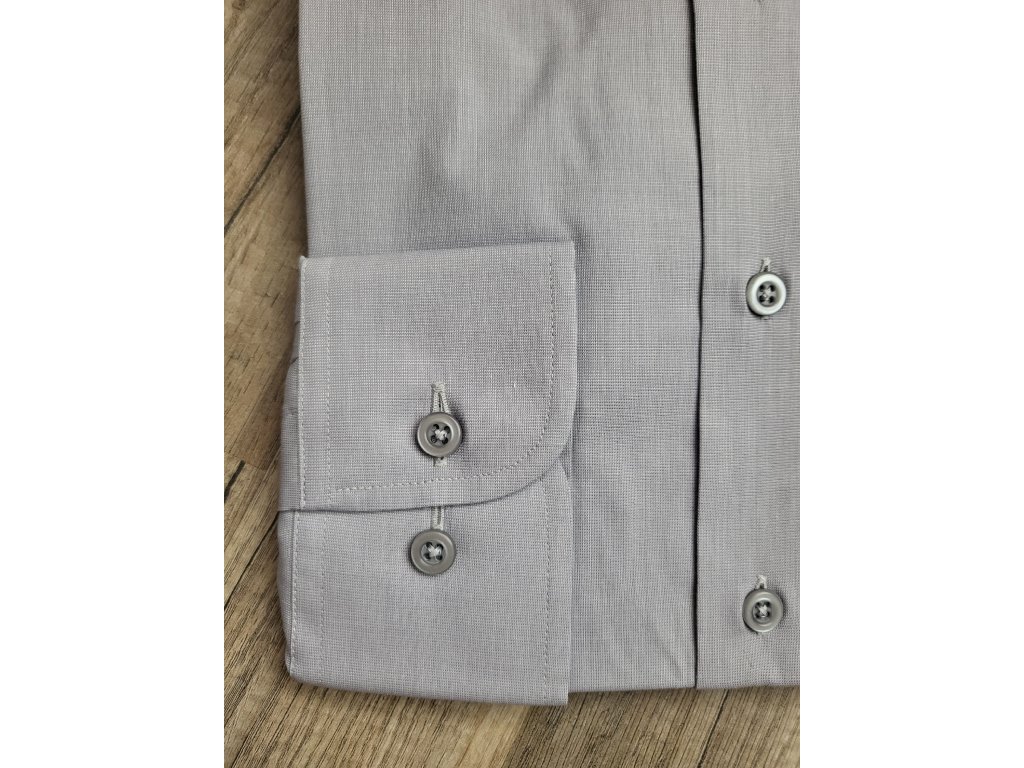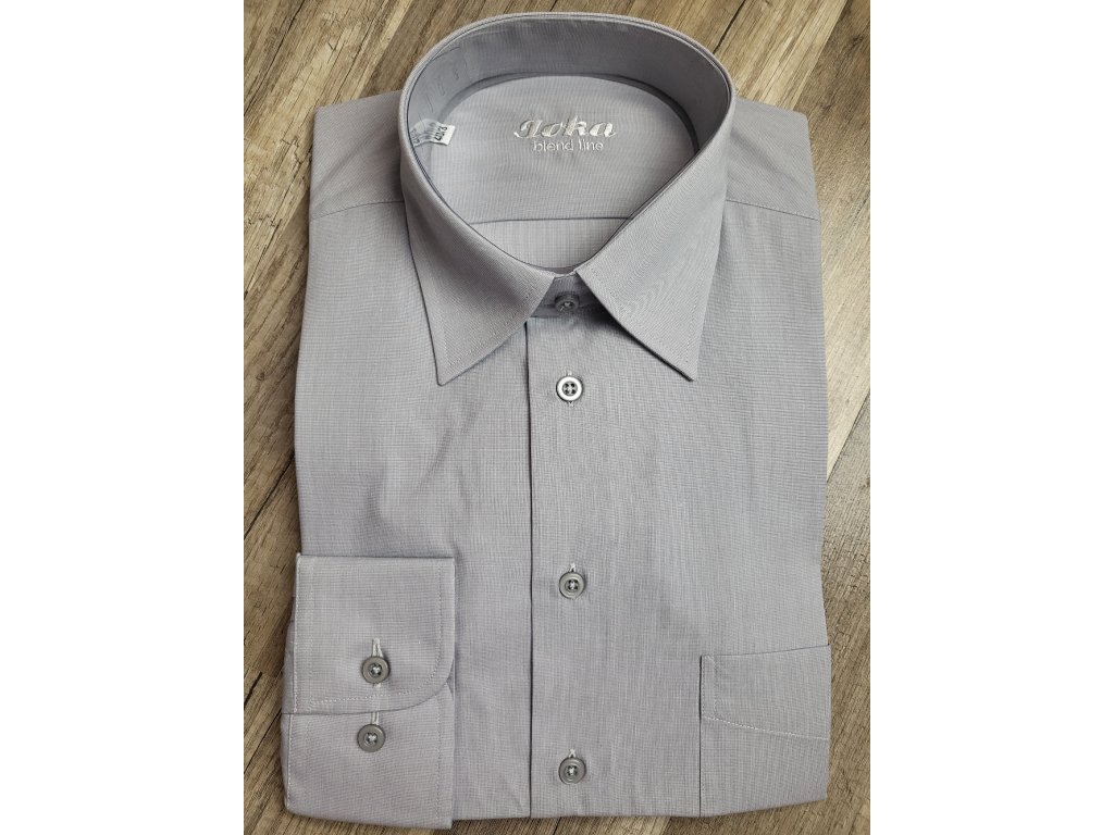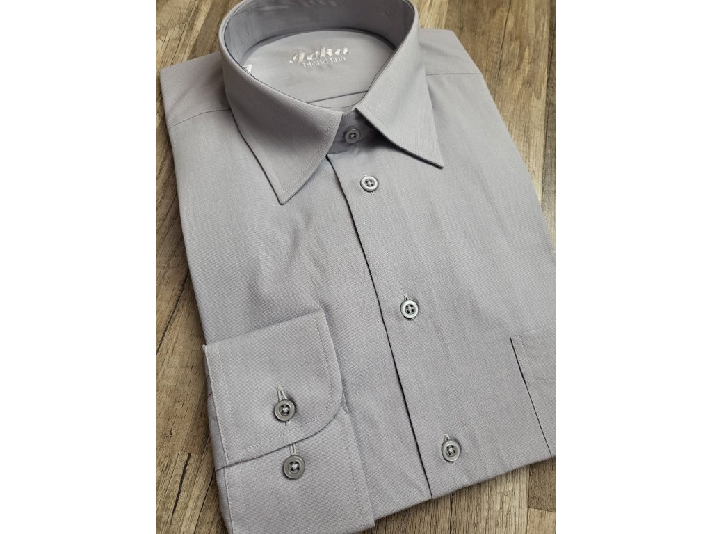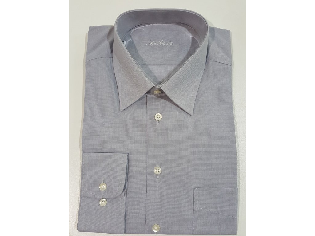 Pánská společenská košile s dlouhým rukávem, je český výrobek. Košile se hodí do obleku ale i k riflím. Je to klasický střih, má jednu náprsní kapsu. Tuto košili zasíláme s bílými nebo šedými knoflíky. Košile je v šedé barvě, hodí se do vzorovaného, modrého nebo černého obleku.