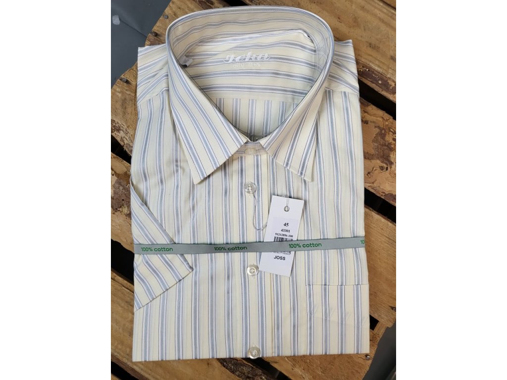 Pánská společenská košile s krátkým rukávem, je od firmy JOKA, český výrobek. Košile se hodí do obleku ale i k riflím. Je to klasický střih.