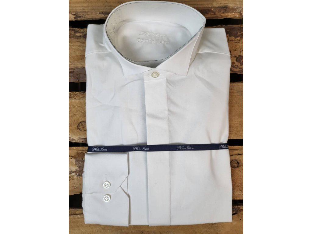 Pánská společenská košile s dlouhým rukávem, je od firmy JOKA, český výrobek. Košile se hodí do obleku ale i k riflím. Je to klasický střih. Košile má jednu náprsní kapsy, košile má knoflíky zakryté. Košile má nežehlivou úpravu, tudíž košili stačí za mokra vyvěsit na ramínko a samo se vyrovná. U košile je přiložený přesný návod.
