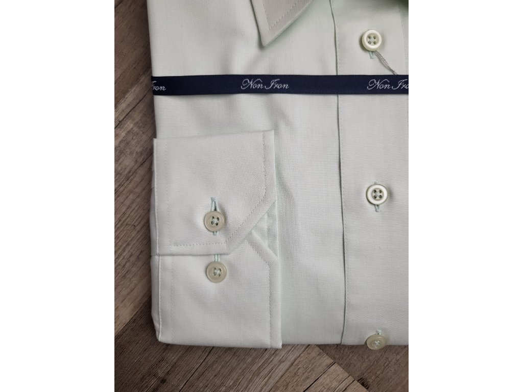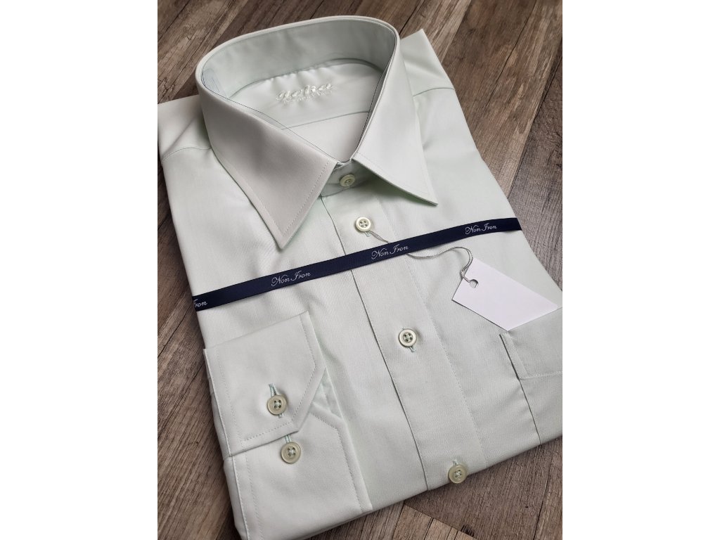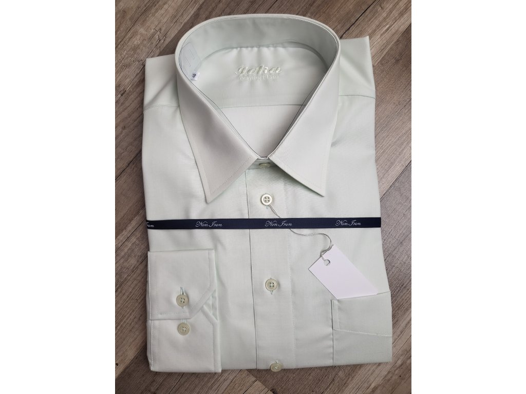 Pánská společenská košile s dlouhým rukávem, je český výrobek. Košile se hodí do obleku ale i k riflím. Je to klasický střih, má jednu náprsní kapsu. Barva je velmi světle zelená, hodí se tedy do černých a šedých obleku nebo saka. Košile má nežehlivou úpravu, tudíž košili stačí za mokra vyvěsit na ramínko a samo se vyrovná. U košile je přiložený přesný návod.