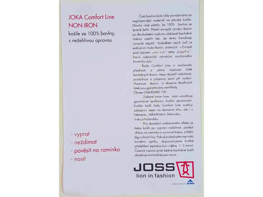 Pánská společenská košile s dlouhým rukávem, je od firmy OP Prostějov, tudíž český výrobek. Košile se hodí do obleku ale i k riflím. Je to rovný zúžený střih - označení slim. Košile má nežehlivou úpravu, tudíž košili stačí za mokra vyvěsit na ramínko a samo se vyrovná. U košile je přiložený přesný návod nebo popřípadě si jej můžete přečíst ve fotogalerii.